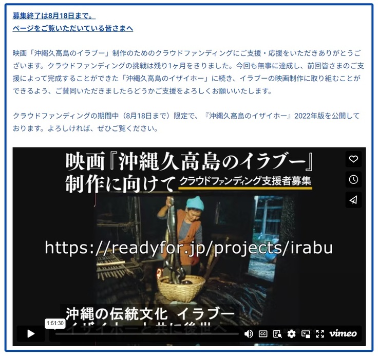 クラウドファンディングの挑戦は残り1ヶ月をきりました。そこでこのたび、クラウドファンディングの期間中(8月18日まで)限定で、『沖縄久高島のイザイホー』2022年版を公開しております。よろしければ、ぜひご覧ください。