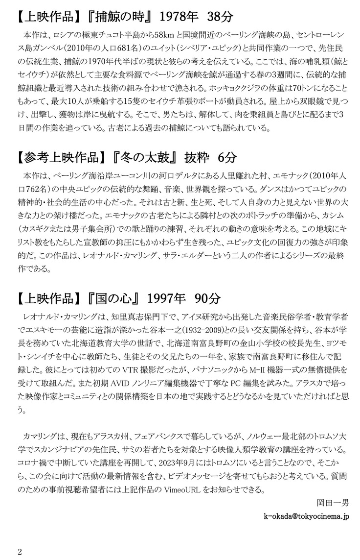 上映作品は、レオナルド・カマリング(アラスカ大学博物館名誉学芸員)による