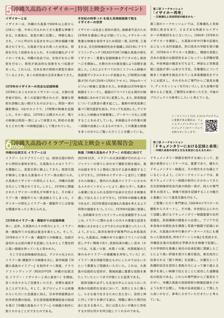 映画制作は順調に進んでおり、今年5月5日(日)には『沖縄久高島のイザイホー』特別上映会・トークイベント、5月6日(月・振替休日)には『沖縄久高島のイラブー』完成上映会・報告会を、いずれも新宿の紀伊國屋ホールで開催いたします。