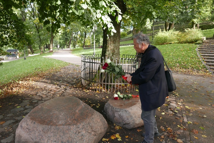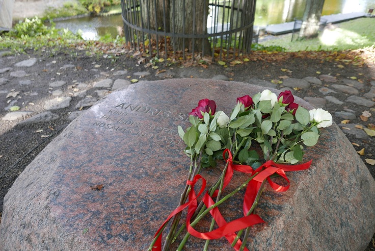 私たちはエストニアのパルヌ映画祭に参加するために、今日(10月10日)はラトビアのリガに入りました。そしてリガ中央公園にあるアンドレス・スラーピンシュ氏の記念碑に献花を行いました。