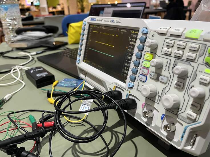 電気信号の測定器であるオシロスコープで波形を確認しながら通電・通信のテストを行っております。実際にインソールの芯に電子基盤やバッテリーをはめ込み、使用時を模した環境でのテストも行っております。