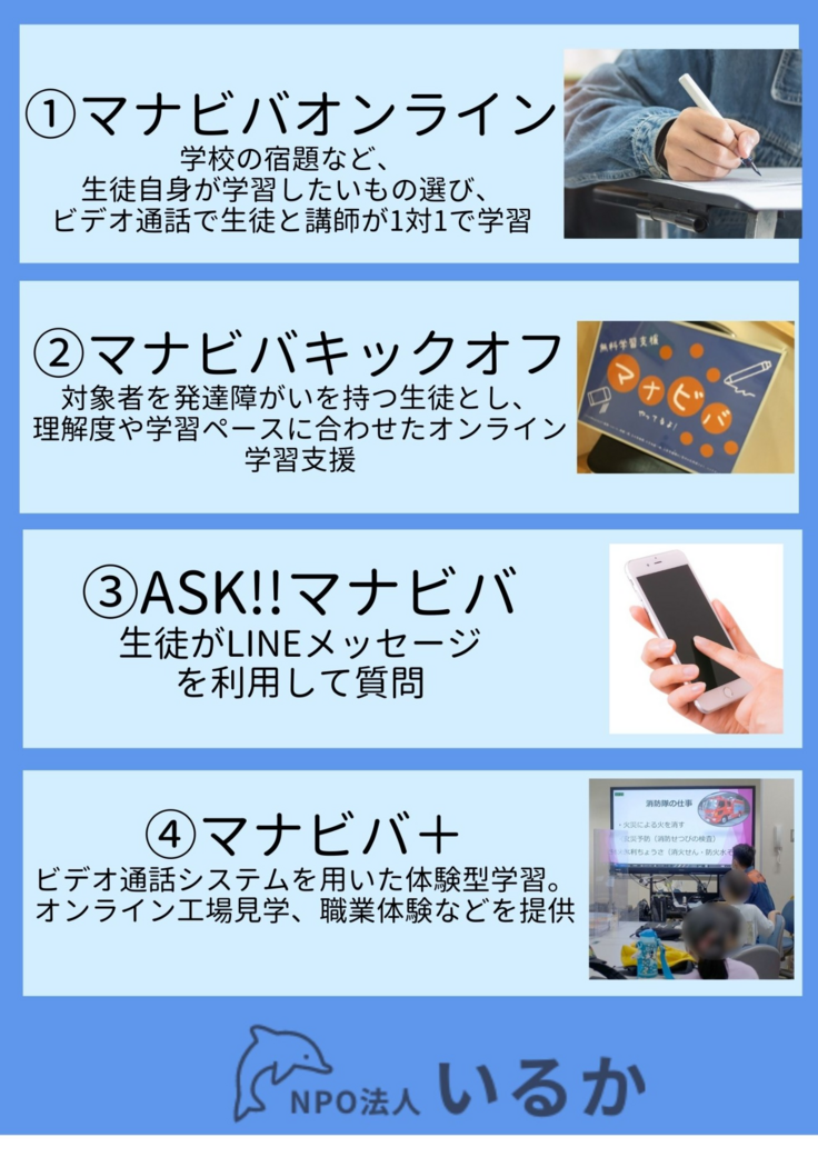学習支援事業「マナビバ」は、「もっと学びたい」「進学したい」、そう思いながらも経済的な事情や家庭の事情で、進学を諦めたり本意ではない進路選択を行わざるを得ない子どもたちが希望をもって進学できる環境づくりを行っています。 2022年7月現在、福岡県、佐賀県、熊本県、長崎県、ネパールで41教室を開催し、約2300人の子どもたちに学びの機会を提供しています。 また、福岡県福岡市・飯塚市・嘉麻市・直方市・田川市・中間市で約40か所の子ども食堂を開設しているほか、フードバンク事業、アウトリーチ(訪問型養育支援)事業も実施しています。