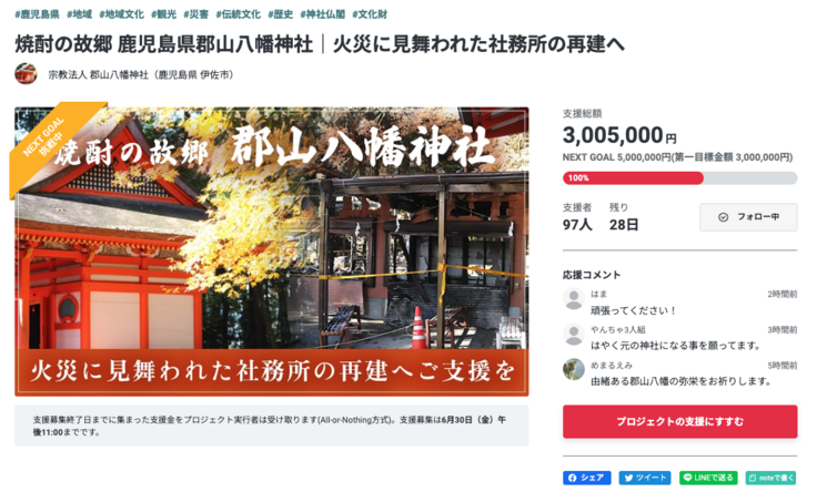 これからも郡山八幡神社が地域の方々の暮らしの中心として、その歴史をつなげるよう、最終日の6月30日(金)23時まで、引き続きのご支援と応援を賜りますよう、何卒よろしくお願い申し上げます。