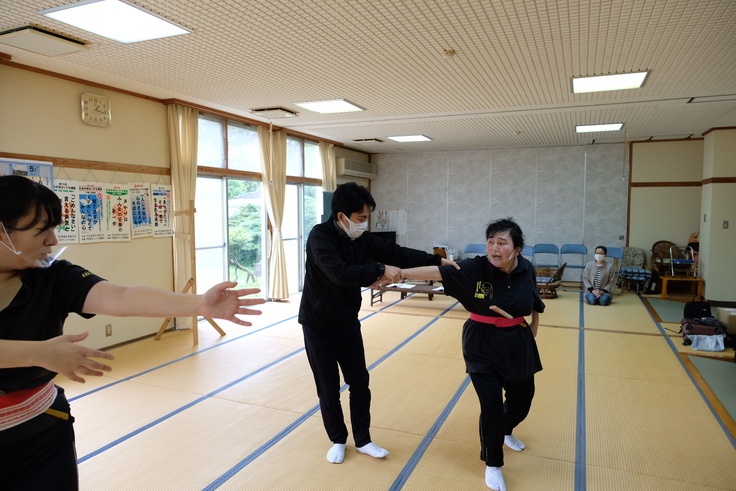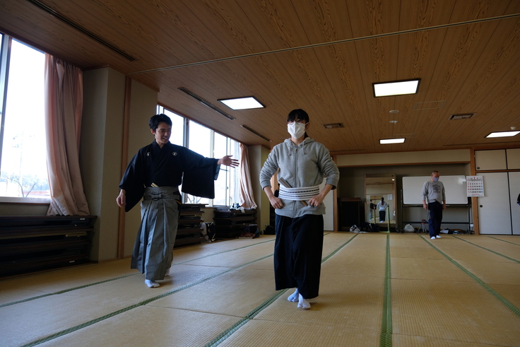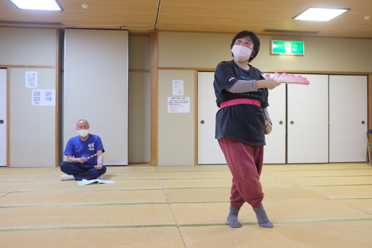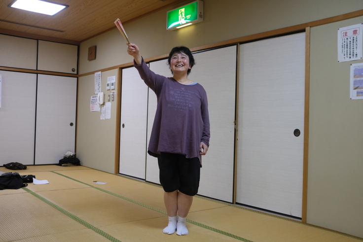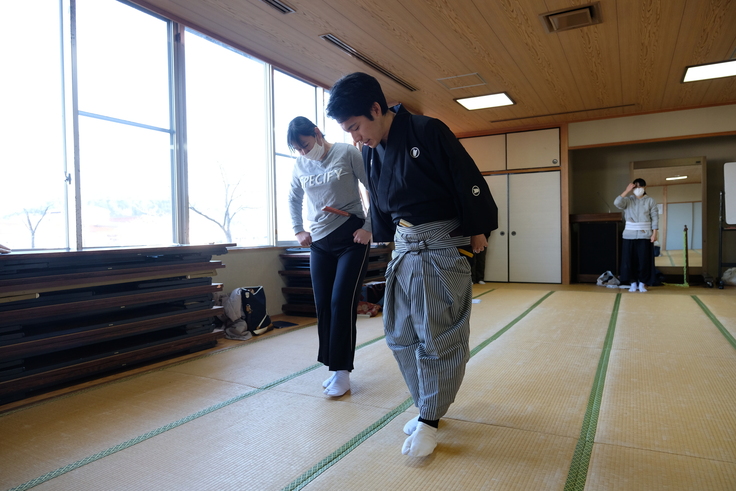 西上…その翌日は大口温泉高熊荘の大広間をお借りしての稽古でした。河野さんに喧嘩の場面の動きを教えていただいたり、ラストのオリジナルの小舞の振り付けをしていただきましたね。
