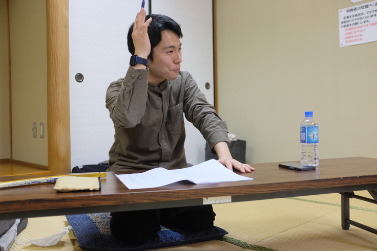 西上…ここで非常口の皆さんが出演してくださることが決定しました。これはボクにとって「第一関門クリア」でした。というのも、こういうご当地狂言を作る時に、東京や京都の狂言師の方に出演をお願いをする、という選択肢もあると思うんです。でもボクは『大工の落書』は、地元の方が演じる形になって欲しかった。ですので、狂言師の方をお呼びして、地元の方に狂言の所作や舞の稽古をつけていただこうと思ったんです。もちろんそれは簡単なことではありません。でも20年以上も自分たちのオリジナルの劇を生み出し続けてきた非常口の皆さんとなら出来るんじゃないかと思ったんです。そして、和泉流狂言師である河野佑紀さんに狂言指導をお願いしました。