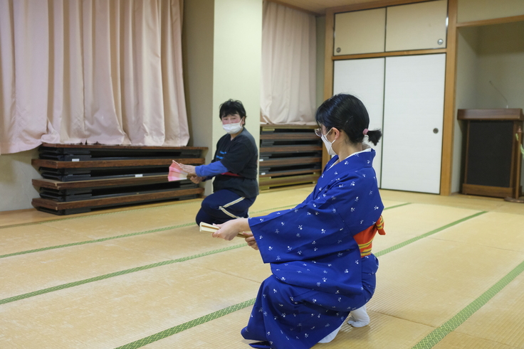 西上…この頃はコロナもあって二人ずつに分かれて稽古していたりしましたね。あと喋らないでいいように舞の稽古にしたり。舞は自分たちだけでは稽古が出来ないので日本舞踊をされている島田さんに河野さんの動きを動画で見ていただいて一緒に稽古をしました。