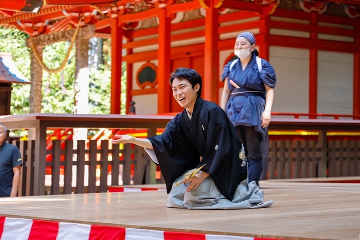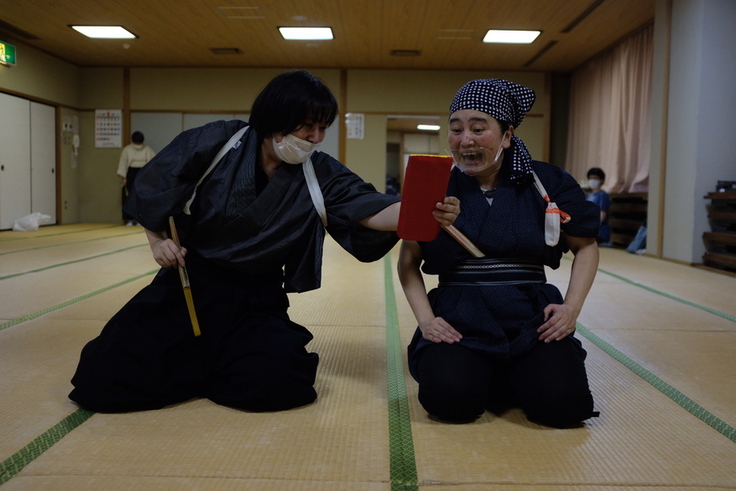 石神…小学生の時の国語の教科書に「附子(ぶす)」が載ってて、狂言をやりたいとは思ってました。それが本当にできるなんて。河野さんには、短時間で一生懸命教えていただいて。時には厳しい時もありました。でも「できる!」と信じてくださっているから厳しく教えてくださっているんですよね。…ちゃんと完璧にしたいね。どんなに厳しくてもいいから。