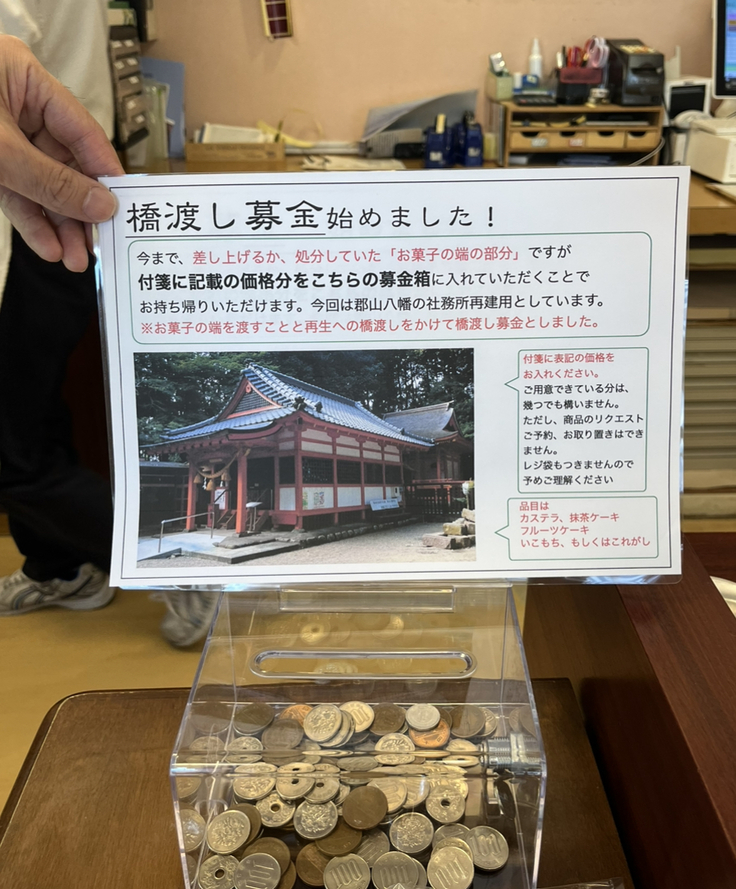 今まで、差し上げるか、処分していた「お菓子の切り落とし部分」ですが、付箋に記載の価格分をこちらの募金箱に入れていただくことでお持ち帰りいただけます。