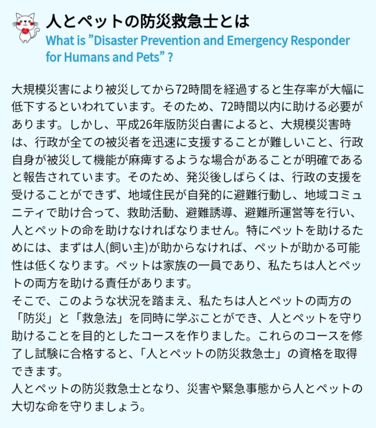 海外と比べ設備も考え方も遅れている日本では、特にペットの救命において、残念ながら公助は期待できません。できるだけ自分でなんとかやるしかないのです!