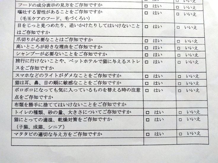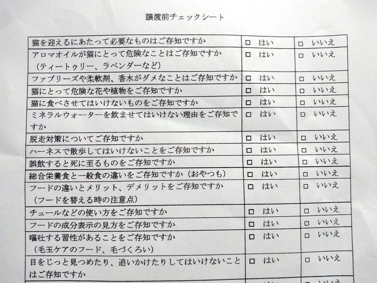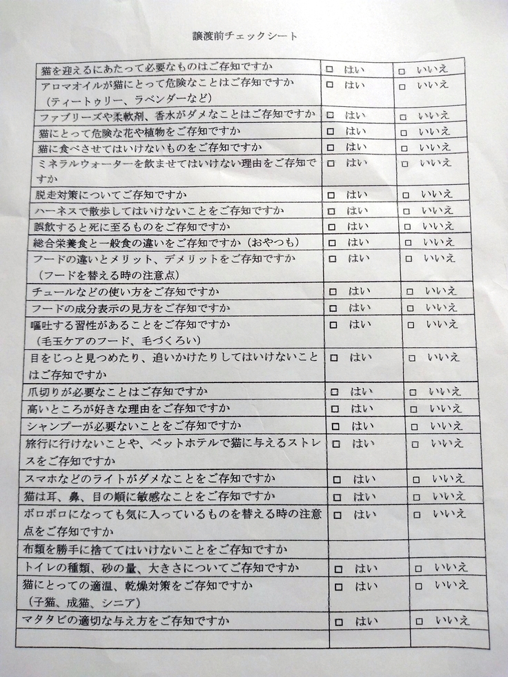 猫と生活するにあたり最低限知っておいてほしいことを確認、チェック✔️していただくための書類です。