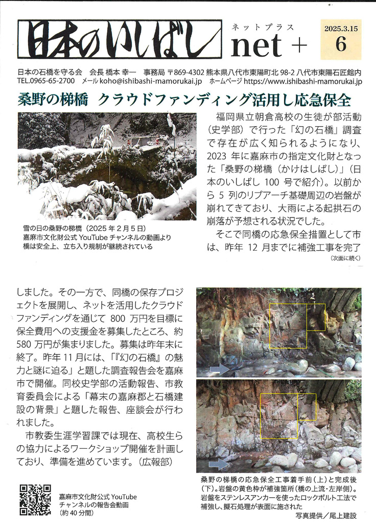 「日本のいしばしnet+」は、日本の歴史的な石橋の保存・調査・活用に関する情報を発信する媒体で、全国の石橋に関する最新の研究成果や保存活動の進捗などが掲載されています。今回の記事では、福岡県立朝倉高校史学部の調査をきっかけに、広く知られるようになった桑野の梯橋の価値や、クラウドファンディングを活用した応急保全の取り組みについて詳しく取り上げていただきました。