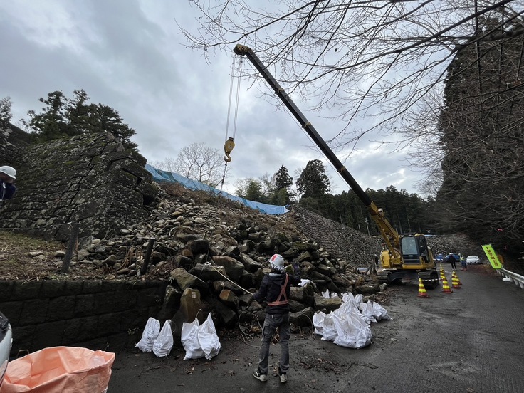 崩落した石は、クレーンで一石ずつ丁寧に取り外していきます。