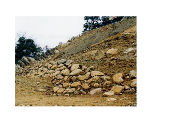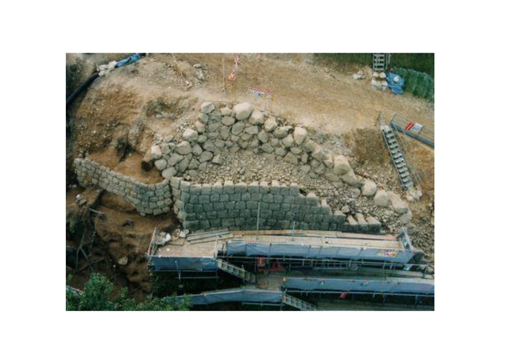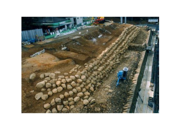 Ⅱ期石垣は北壁石垣の東部でIII期石垣の背後から見つかりました。築石は割石が使用され、Ⅰ期石垣に比べると、大型で奥行きが長くなるように据えられており、表面にノミ加工を施すものも見られます。築石同士のすき間には詰石が詰められています。石垣の勾配は約60度です。この石垣は寛文8年(1668)の地震により被災したと考えられます。
