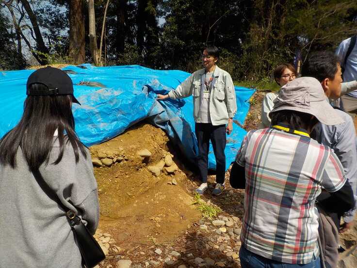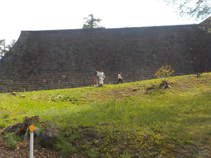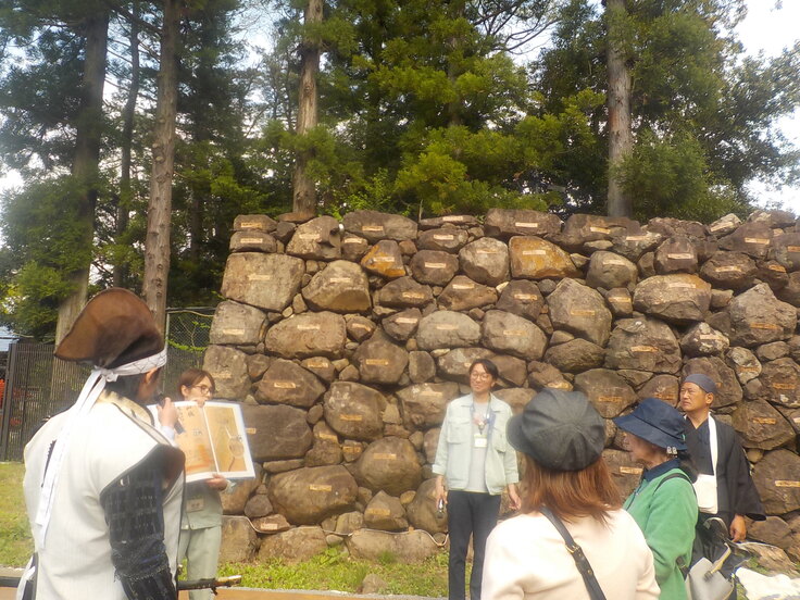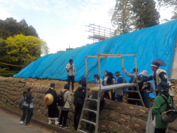 今回特にご好評だったのは、現在関係者以外立ち入り禁止となっている本丸北西石垣付近へのご案内です。石垣の復旧現場のリアルな裏側に皆さん興味深々。
