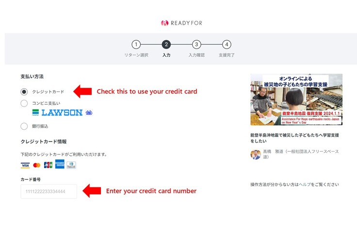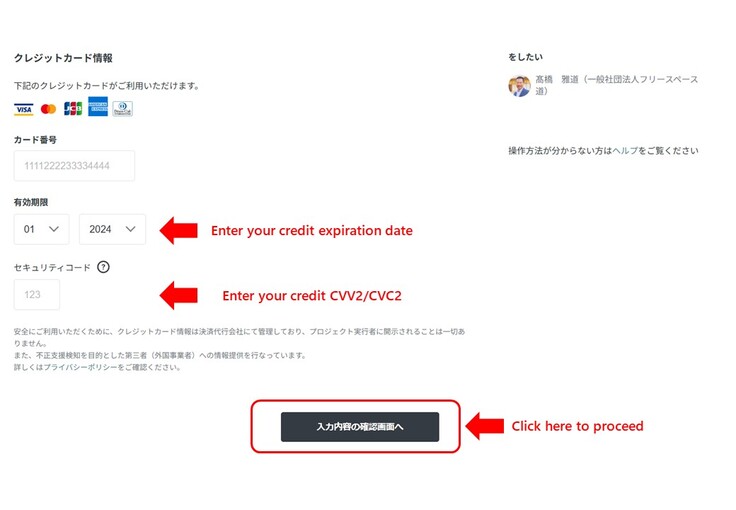 After you selected your amount of contribution, please check the button in the interface below and enter your credit card number, card expiration date, and card CVV2/CVC2.