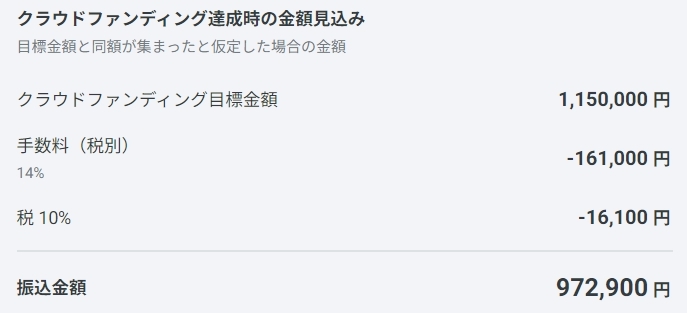 上記の見積金額935,000円に対し、手数料等を考慮して、目標金額を1,150,000円と設定させていただきました。