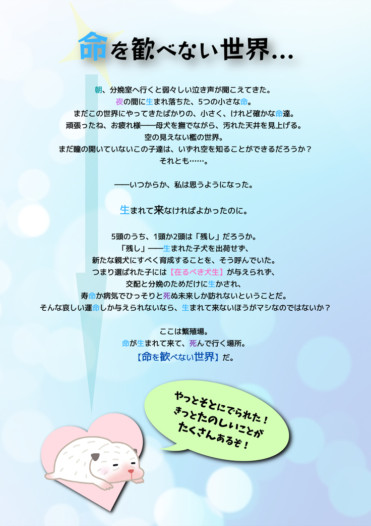 パピーミルで勤務していた時――助けられなかったあの子の顔が、外に連れ出せなかったあの子の瞳が、冷たくなったあの子の感触が、土をかけられ見えなくなってゆくあの子の亡骸が、灼きついて離れないのです。