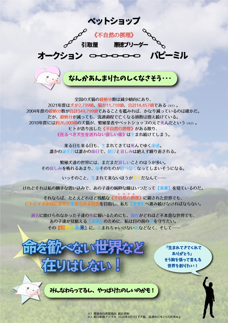 愛護センター、愛護団体、ペットショップ、パピーミル、オークション……わんちゃんを取り巻く今の世界は、何が善で誰が悪なのか、もはや簡単には言えない状況になっています。