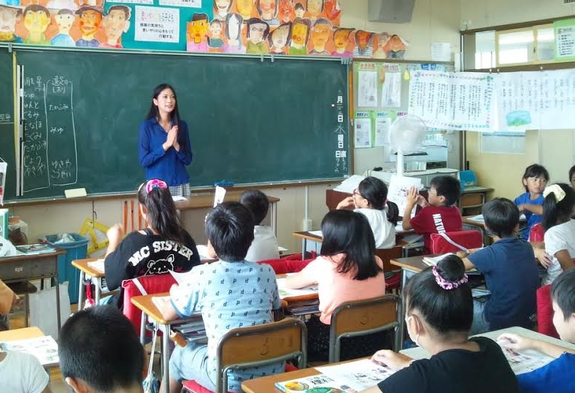 (出演モデルの1人山田彩乃が、今回のイベント開催小学校で特別授業を行っている様子です。)
