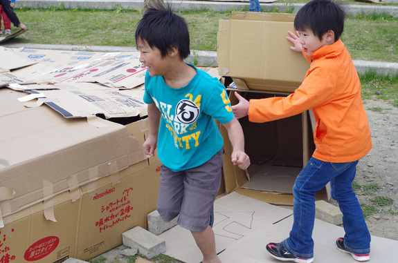 今年のゴールデンウィークには、中瀬公園で「子どもと一緒に遊び場を作るイベント」を開催しました。子どもたちは自分たちの独自の創意工夫で、捨てられる前に拾ってきた段ボールで、映画館や迷路など、独自の世界を中瀬の広場に作って、何度も繰り返し遊んでいました。学校では手にできないような、のこぎりやナイフを手にして独自の世界を組み立てています。遊びに来てくれた、2年生のイチローくんは、まだひんやりした風が吹いている中で、一生懸命つくった段ボールの迷路の中を何度も何度も裸足で走り回っていました。