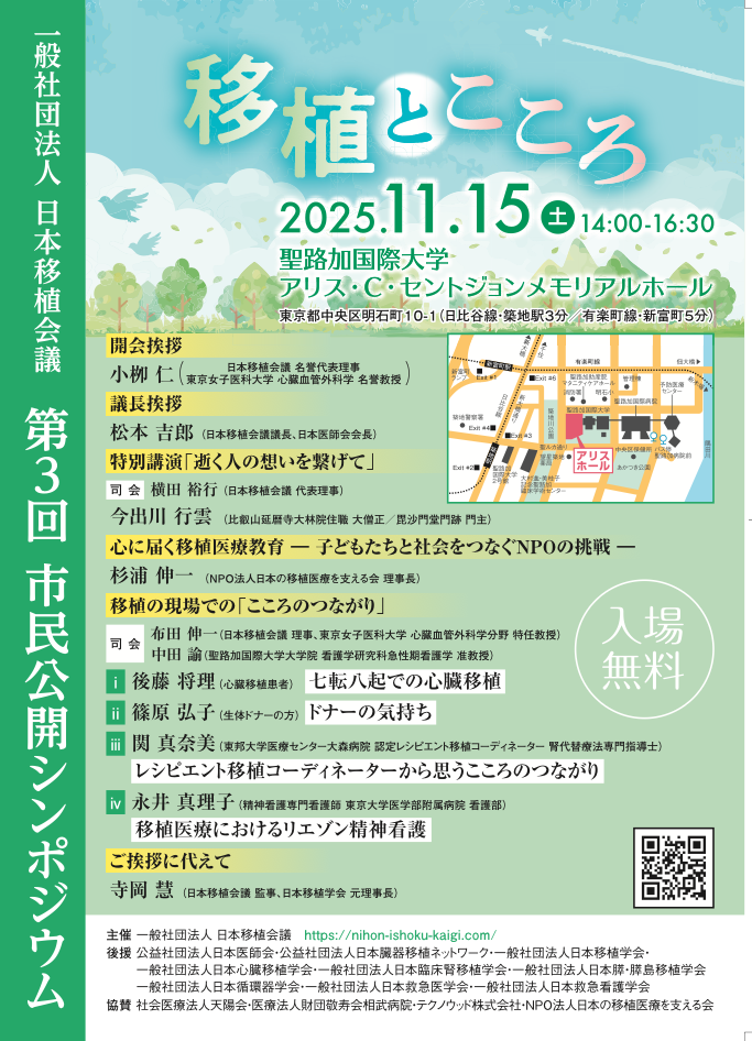 本年11月15日には、移植を受ける側、提供した側、移植医療に携わる側の多方面から移植医療を見つめてもらうため、第3回市民公開シンポジウムを開催します。