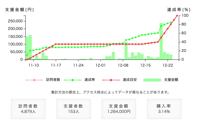 現在、153名の方から126.4万円のご支援。達成率84%。残り25万円。
