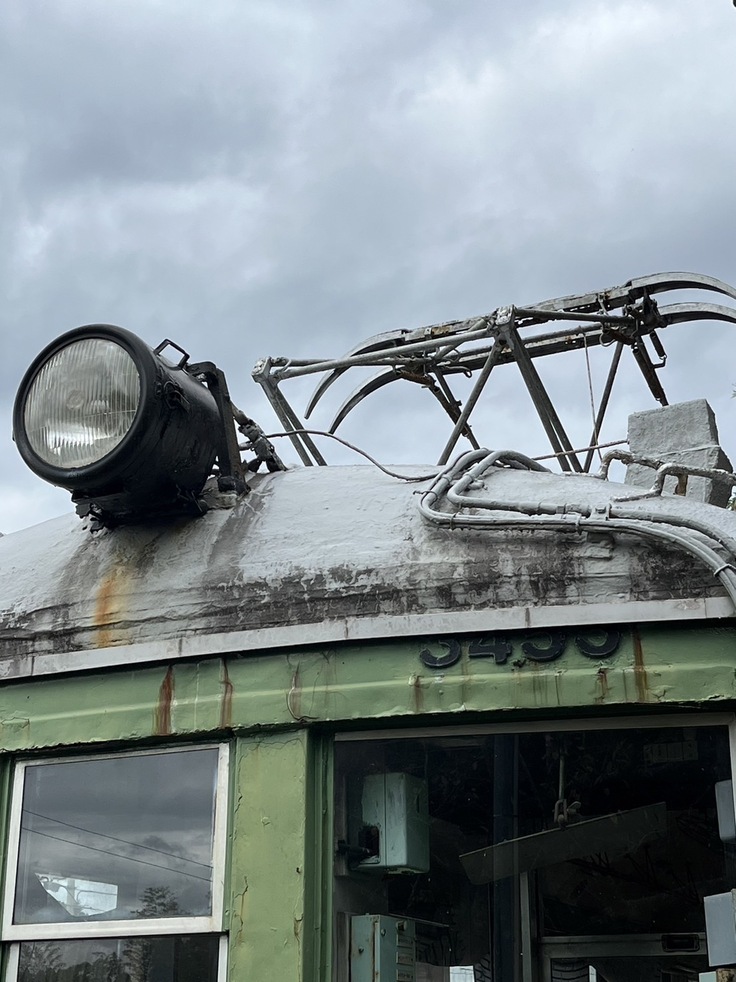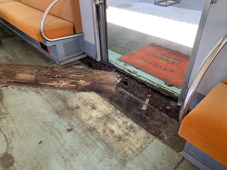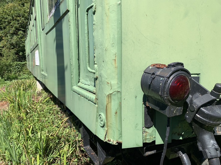 そんな仲間である“東急デハ3455”ですが、劣化により大きく損傷しております。床がぬけ、象徴的な色であるグリーンのボディは褪せ、側面は腐食で浮いてきており、このままでは時を経ずして朽ちていくことが目に見えております。