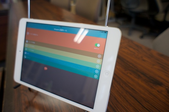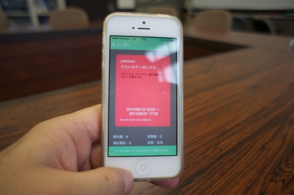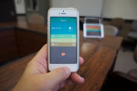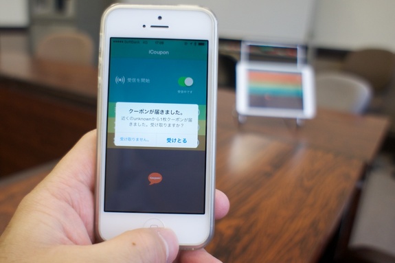 このアプリは,技術的には,iOSの「iBeacon」という技術を使っています。これはBluetoothの電波を使用していますので,お店側の送信機(iPhoneやiPadなど)の20メートル以内(理論値です)のアプリユーザーにクーポンを配信します。受け取り側のiPhoneがスリープ状態でも,ちゃんと受信することができます。