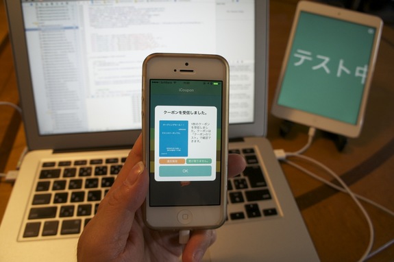 テスト機材は,私が使用しているiPhone 5と,iPad miniを使っており,テスト機材はこの二つのみです。ですので,例えば「2台のiPadが同時にクーポンを配信しているところに,1台のiPhoneが通りかかったときにどのような挙動があるか」であるとか,「1台のiPadがクーポンを配信しているところに,3台のiPhoneが通信範囲から出たり入ったりした場合どうなるか」といったテストができません。