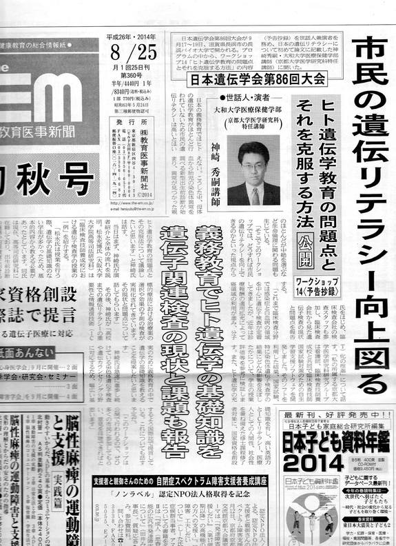 日本遺伝学会第86回大会において「ヒト遺伝学教育の問題点とそれを克服する方法」(市民公開ワークショップ)を開催した際、株式会社教育医事新聞(月刊)、初秋号(8月25日発行) にインタビュー記事が掲載されました。