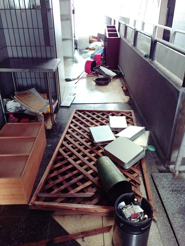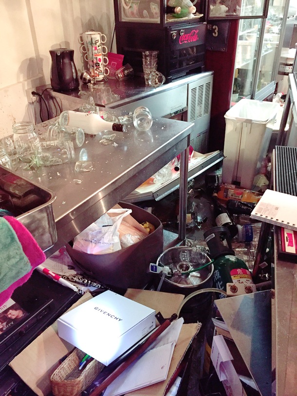 熊本地震以降、予約取り消しが相次ぎ、早い時間帯も含めて売り上げが0が続く毎日…。お店を存続させる事が難しくなる苦しみを味わいました。自店の被害状況は冷蔵庫の倒壊やボトル、グラス、お皿や照明の破損がひどく、売り上げの損失額はその損失の4倍におよびました。4月は地震以降は1日も営業ができず、5月はGW途中からの営業を再開しましたが、平月の4分の1の売り上げでした。