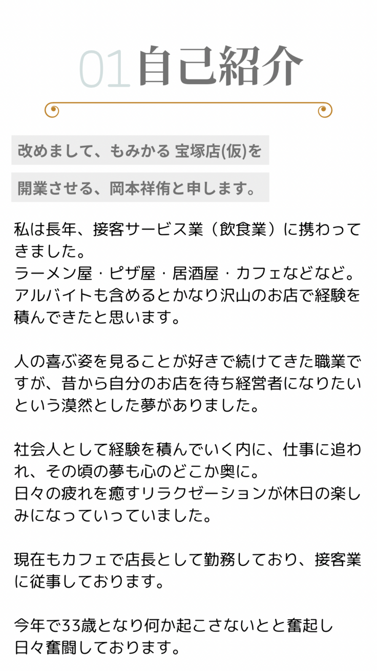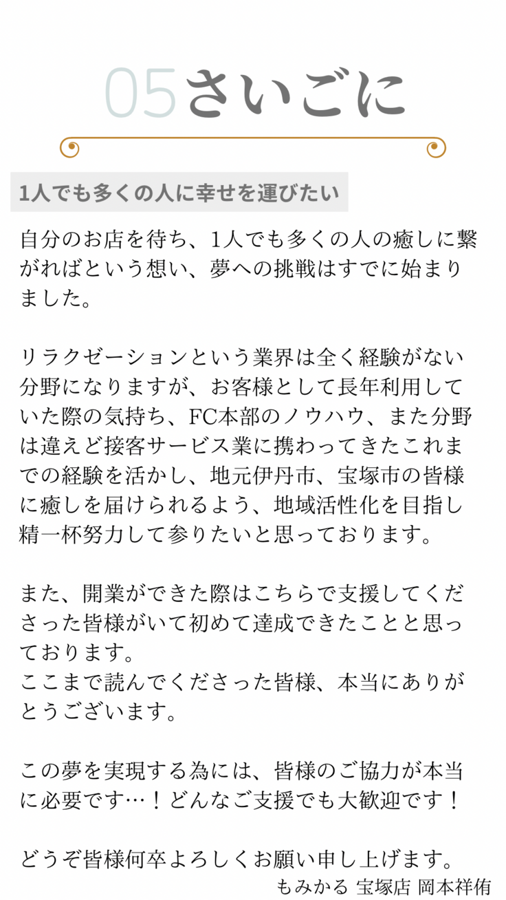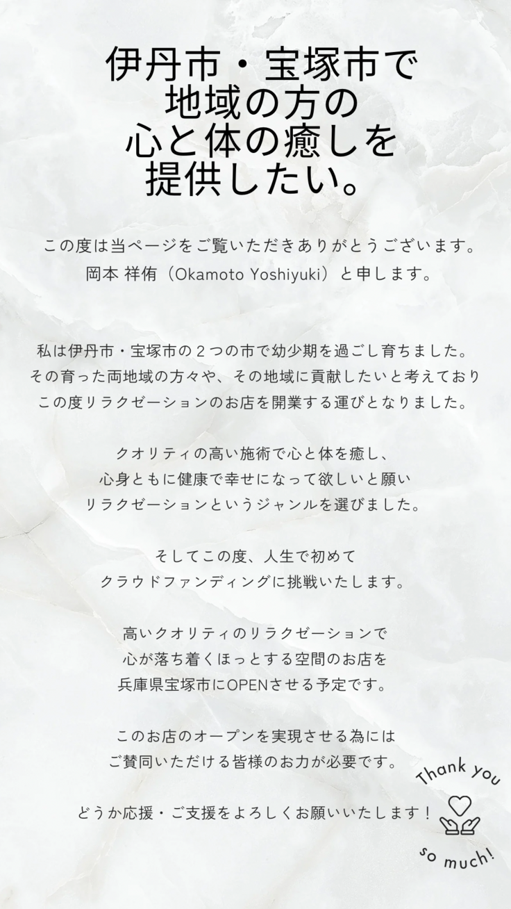 初めまして! こちらのページにご興味を持っていただきありがとうございます。 私は伊丹市、宝塚市で育ち、両地域の方の心と体の癒しを提供し、地域活性化を目指したいと考えている岡本と申します。 自己資金+融資にて起業したいと考えているのですが、少しでも起業の費用に当てたいと考えこの度募集させていただきました。 どうぞよろしくお願い申し上げます。