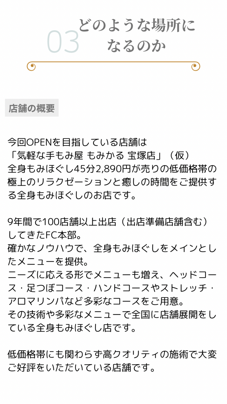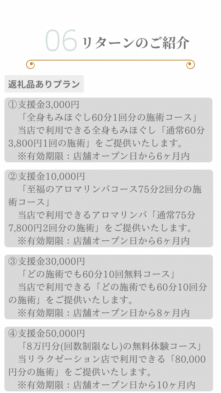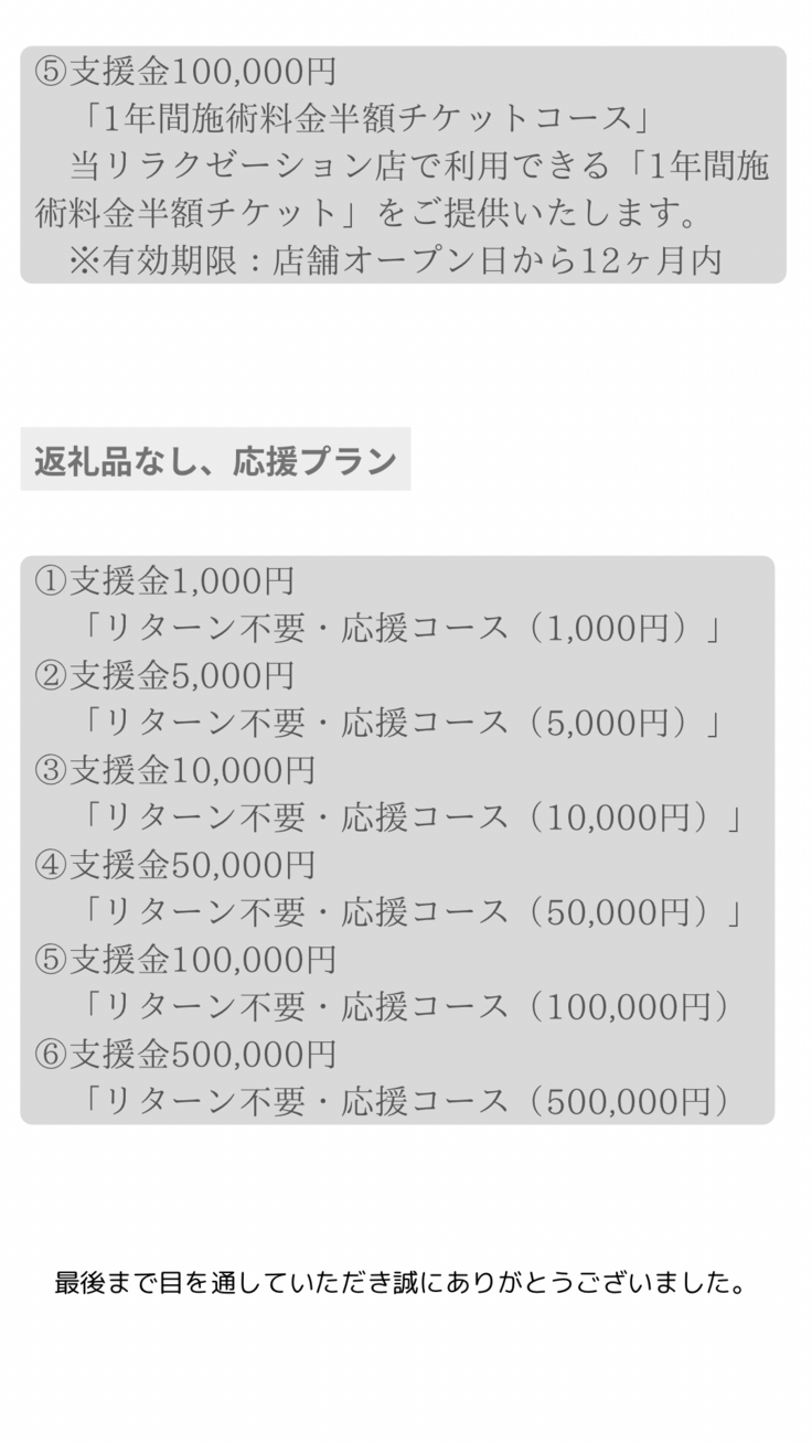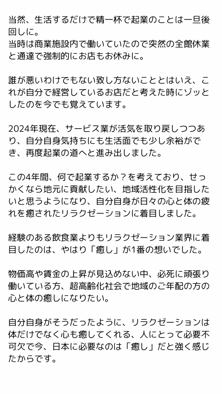 初めまして! こちらのページにご興味を持っていただきありがとうございます。 私は伊丹市、宝塚市で育ち、両地域の方の心と体の癒しを提供し、地域活性化を目指したいと考えている岡本と申します。 自己資金+融資にて起業したいと考えているのですが、少しでも起業の費用に当てたいと考えこの度募集させていただきました。 どうぞよろしくお願い申し上げます。