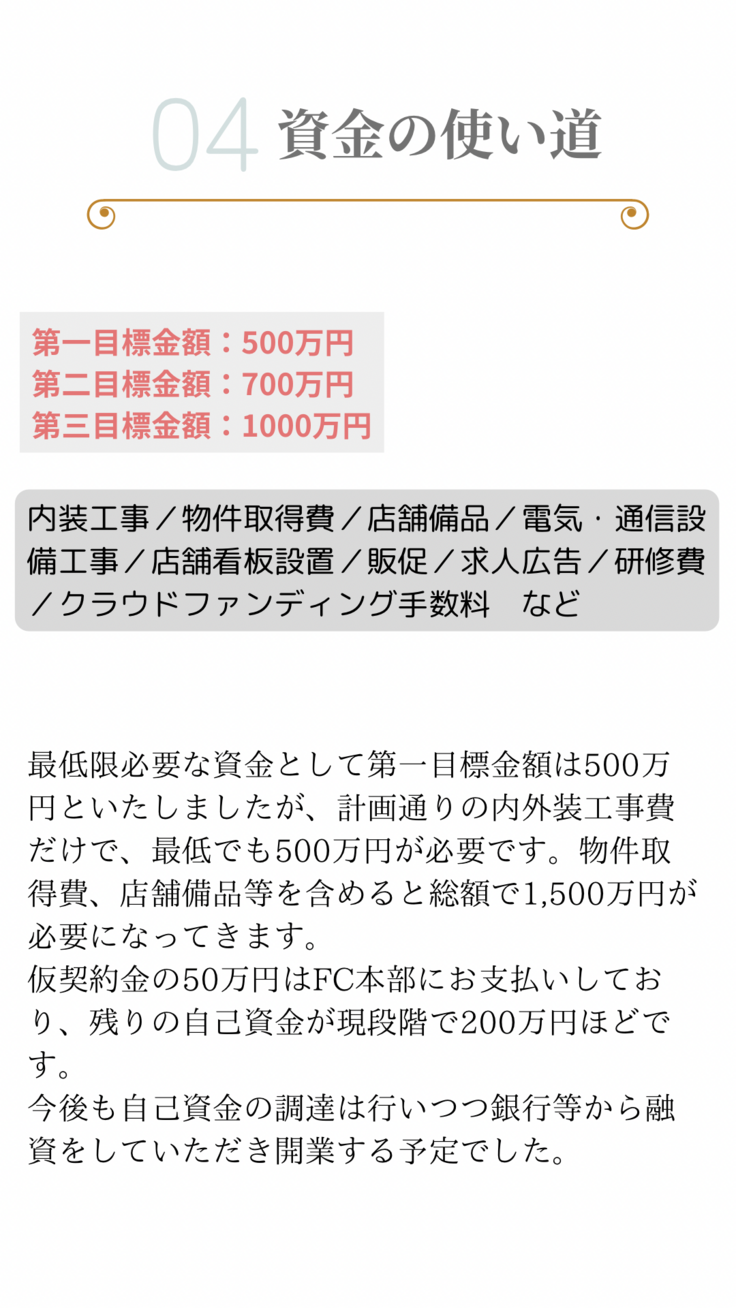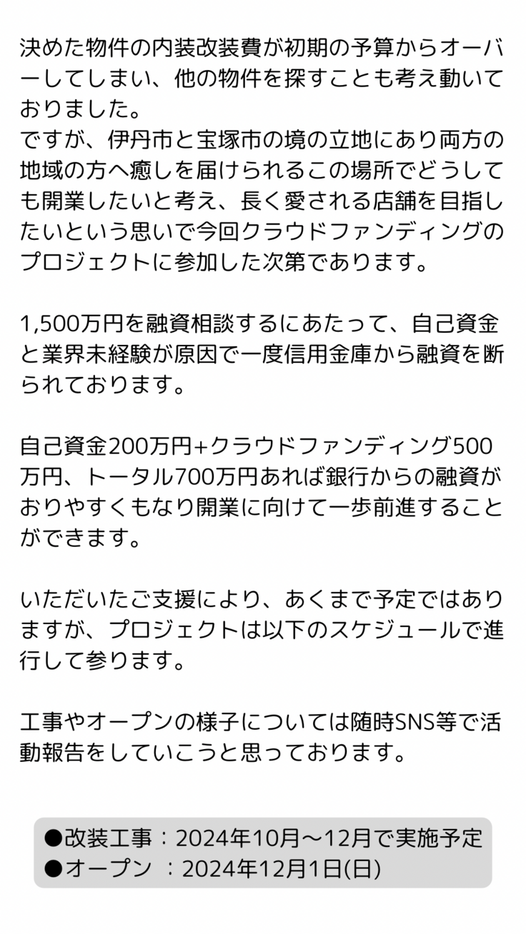 - クラウドファンディング500万円+自己資金200万円、トータル700万円で、万が一銀行や信用金庫から融資が降りない場合は一旦白紙に戻り、初期費用の見直し、又は削減、物件探しからの再スタートとなります。 開業までの期間が伸びてしまいます。 断念する、ということはありませんが支援していただいた方はのリターンのお返しも伸びてしまうこととなります。