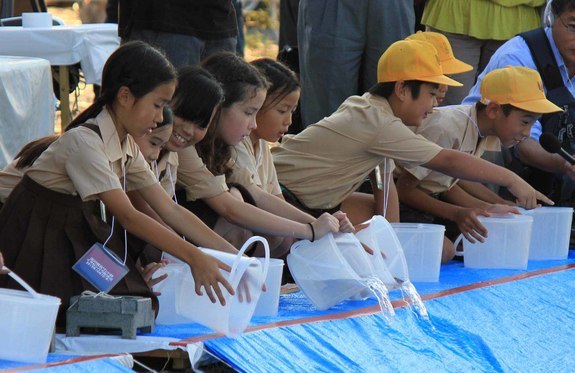 (平成25年10月に、500尾のイタセンパラ親魚公開放流の様子です。)