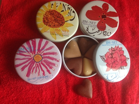 1万円と2万円の引換券には、ジムネット特製のチョコ募金用のチョコ1缶をお贈りします。ジムネットは今年も12月1日から、チョコ募金の受け付けを始めました。2006年から毎年冬に行ってきたもので、今年のテーマは「いのちの花」。イラクの小児がんの子供たちが描いた花の絵をデザインしました。チョコの製造は北海道帯広市に本店を持つ老舗「六花亭」です。