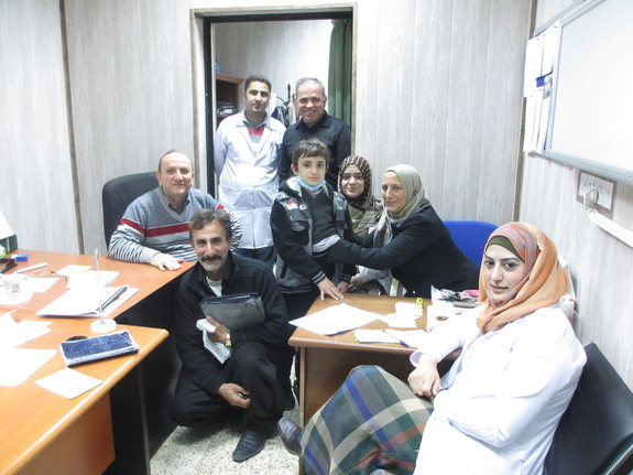 【検診に訪れたアブダラアジズ君を囲む「ナナカリ病院」の医師や看護師らのチーム。現時点で快方に向かっているため表情も明るい】