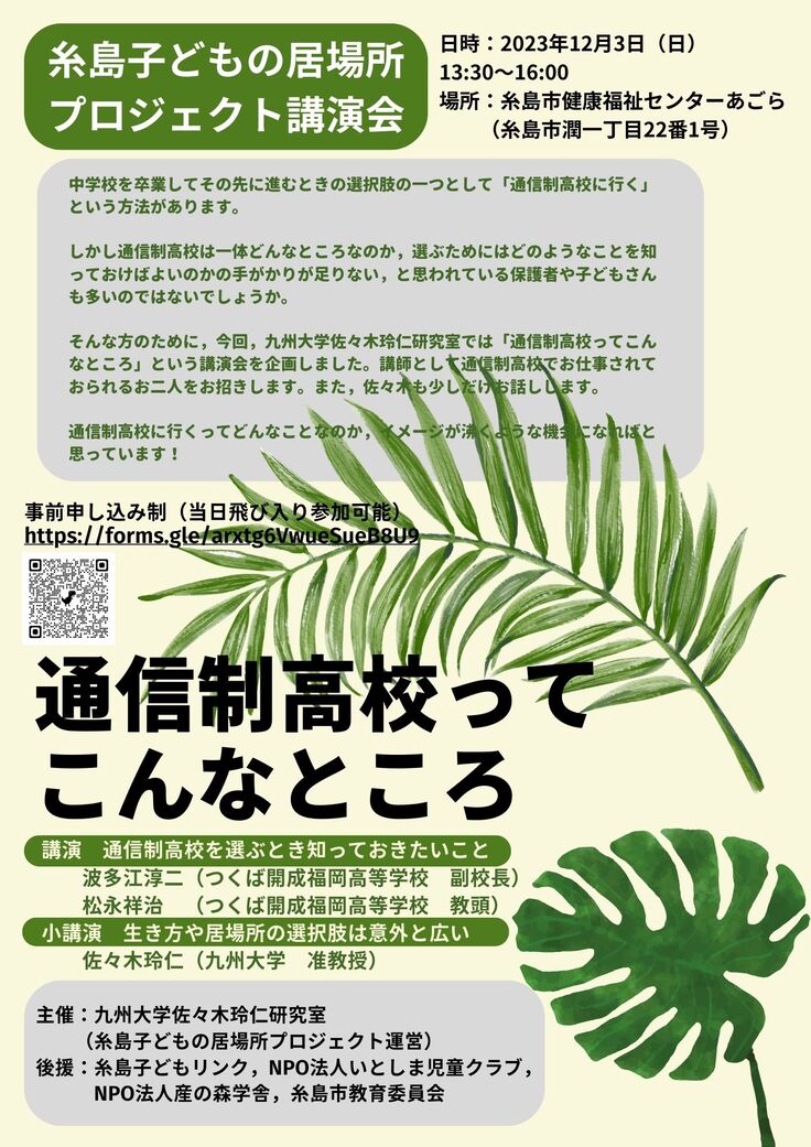 そこで糸島子どもの居場所プロジェクトでは,今現在通信制高校でお仕事されている方を招いて,「通信制高校ってこんなところ」という講演会を開くことにしました。講師としてお招きするのは福岡の天神にあるつくば開成福岡高校の波多江副校長先生と松永教頭先生です。タイトルは「通信制高校を選ぶとき知っておきたいこと」。それから佐々木も「生き方や居場所の選択肢は意外と広い」という短いお話しをします。