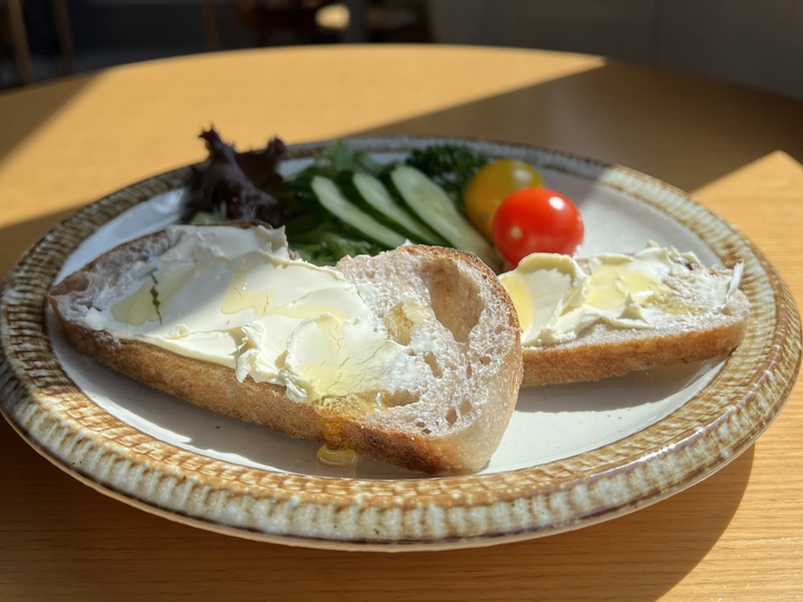 現在、移転後のモーニング実施に向けて糸魚川市の薪のかまどのパン屋「Ragged oven」さんのパンで、モーニングプレートを試作しているところです。