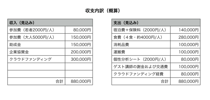 このキャンプには、一人あたり約13,000円(合計約80万円)の経費がかかりますが、参加する若者の負担は一人2,000円(合計約8万円)、ボランティアスタッフが一人5,000円(合計約15万円)、助成金が15万円、企業協賛金が20万円を想定しており、残り22万円をクラウドファンディングでご支援いただきたいと考えています。