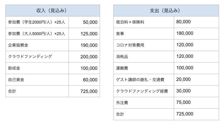 このキャンプには、一人あたり約15,000円(合計約71万円)の経費がかかりますが、参加する若者の負担を一人2,000円(合計約5万円)、ボランティアスタッフを一人5,000円(合計約11万円)に抑えるため、次のような資金計画を立てています。