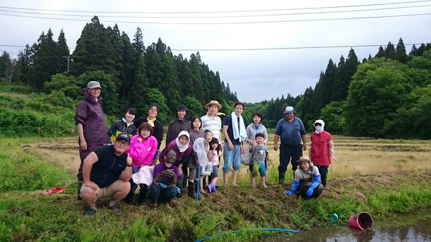 午前中は雨だったため伝統料理のじゅんさいだまこ鍋づくり体験のあと早めの昼食。昼過ぎに雨が止んだため短い時間でしたが田植えを体験してもらいました。