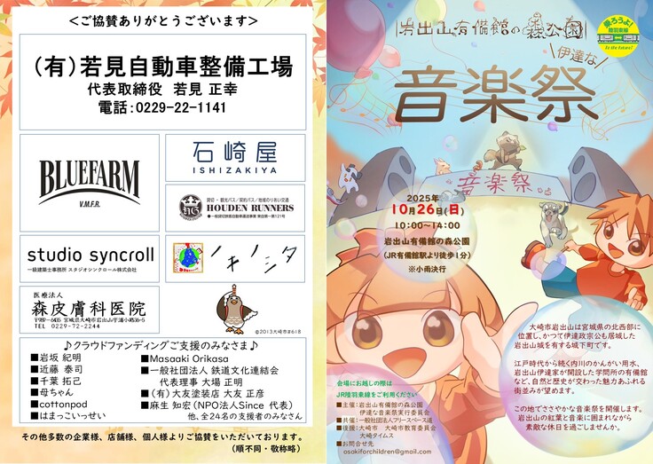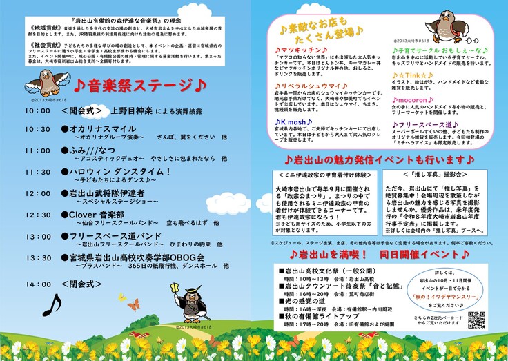 パンフレット内には、音楽ステージのスケジュールや出演団体、出店の情報を掲載している他、今回のプロジェクトである同日開催イベントのご案内(特に、岩出山のイベント情報を一度にご覧いただける「イワデヤマンスリー」のページへのQRコードも記載しています。)もあります。