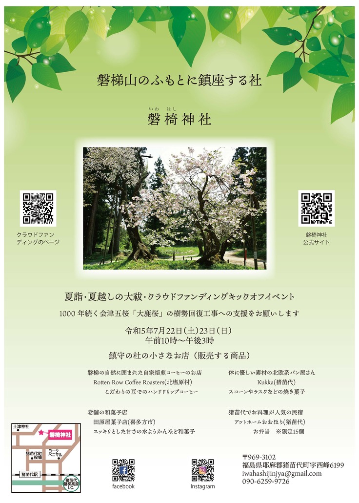 そこで新たな試みとしてスタートしたクラウドファンディング。千年続いた大鹿桜を次の世代に残したいという宮司以下、職員一同の思いで始めました。7月22、23の両日、午前10時から午後3時ごろまで、夏詣・クラウドファンディングキックオフイベントとして、小さなお店が出店します。クラウドファンディングの登録が難しい人の代理申請も受け付けます。皆様と会えるのを楽しみにしております。