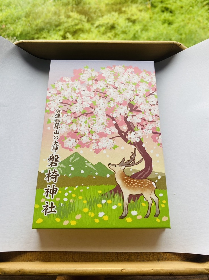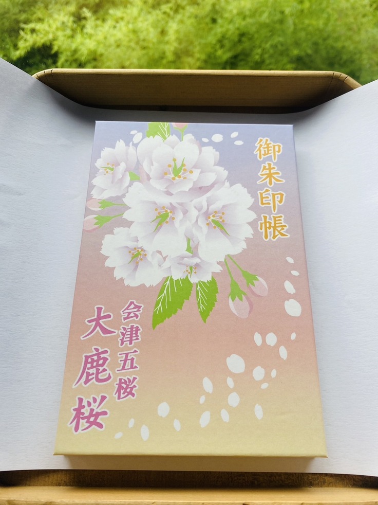 大鹿桜の御朱印帳の見本が完成しました。表紙は大鹿桜のアップのデザイン、裏面は遠くに磐梯山を望み、大鹿桜と鹿の親子を描いています。紙は墨文字が書きやすい鳥の子和紙を使用しています。ラミネート加工もしてあるので水にも強いです。