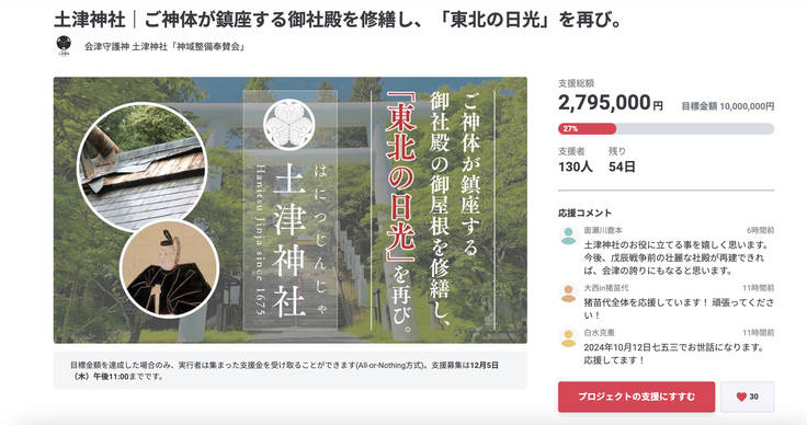 そんな大変な状況下で、ゆかりのある磐椅神社としても土津神社のクラウドファンディングを応援していきたいと思います。