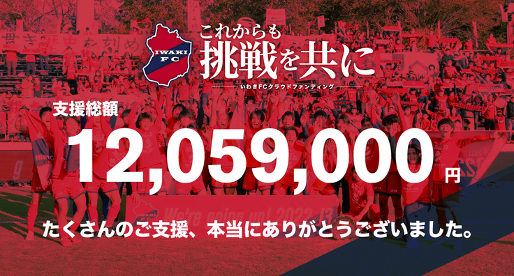 11月25日にスタートした本プロジェクト「来たぞJ3。これからも挑戦を 共に|いわきFCクラウドファンディング」は、766人と本当に多くの方々 からご支援を賜り、支援総額は目標を大きく超える12,059,000円となり ました。(12月22日終了時点の速報値)