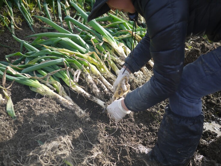 岩津ねぎは「甘くて、太くて、柔らかい」のが特徴で、白ねぎと青ねぎの両方の長所を持っており、濃い緑色の葉先から白い根っこの部分まで余すことなく食べられます。大きく伸びる緑色の葉先は非常に繊細で、一本ずつ手作業で丁寧に収穫します。