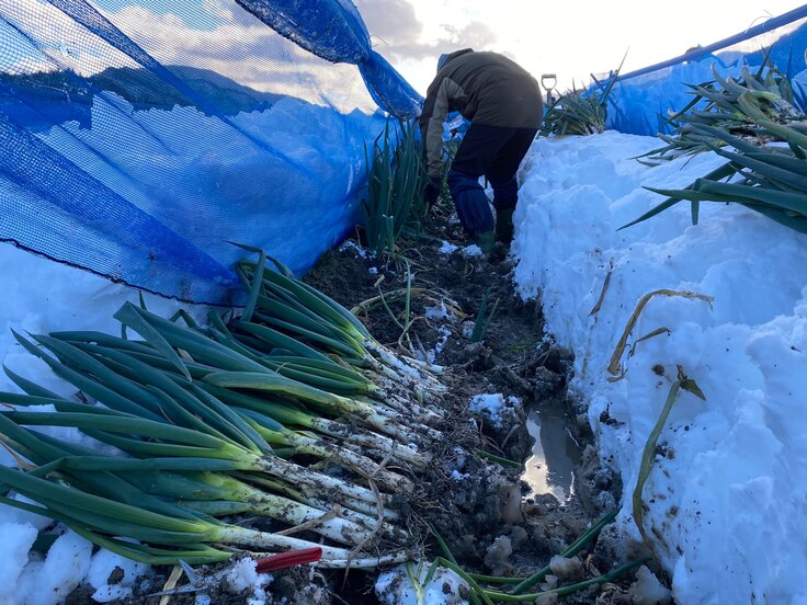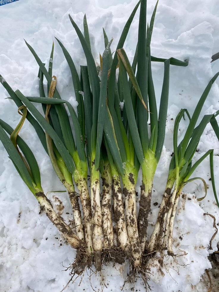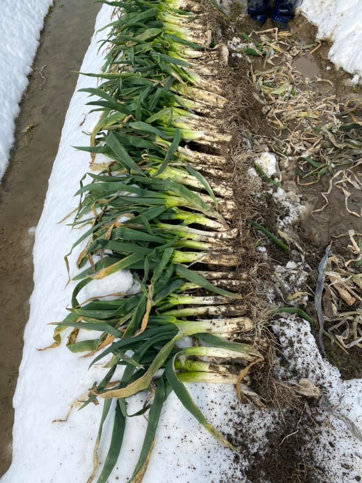 また、雪除けネットを設置していない圃場の岩津ねぎは雪で完全に埋もれてしまい、雪が解けるまで収穫ができません。年末以降も断続的に雪は降り続けて、ようやく雪が溶けて埋もれた岩津ねぎが姿を現したのは2月に入ってからでした。