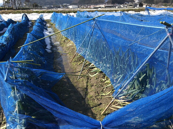 生産地では岩津ねぎを雪から守る為に雪除けネットを設置していますが、今までに経験のない大雪で雪除けネットを支える支柱が折れ曲がって倒壊している圃場もたくさんありました。